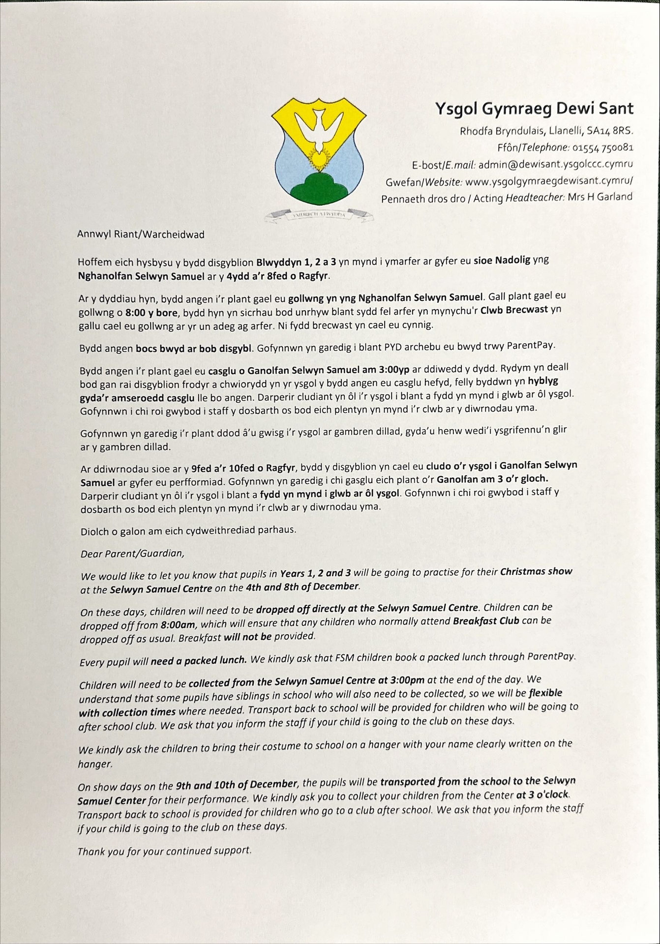 Llythyr at rieni Blwyddyn 2 / Letter for Year 2 parents